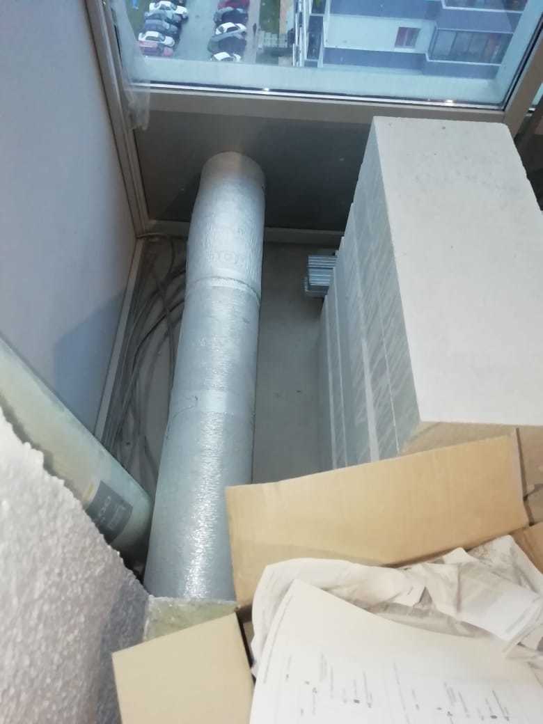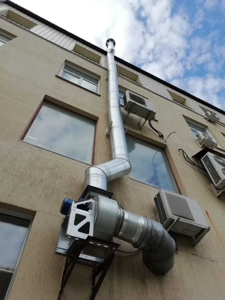 Проброшен вытяжной воздуховод вдоль фасада здания высотой 25 метров. Воздуховод прямошовный. Все соединения изолированы специальным герметиком. Полностью изменена система крепления, при сильном ветре отсутствует биение о фасад. Все делалось при работающей вытяжке.