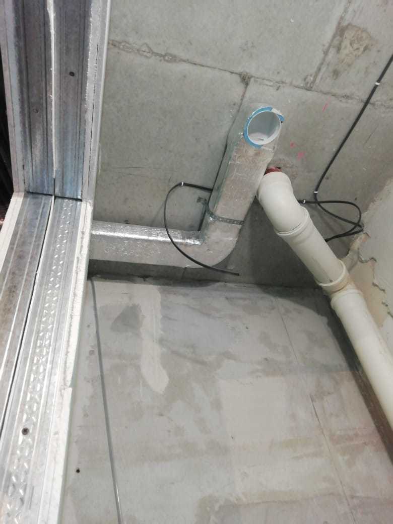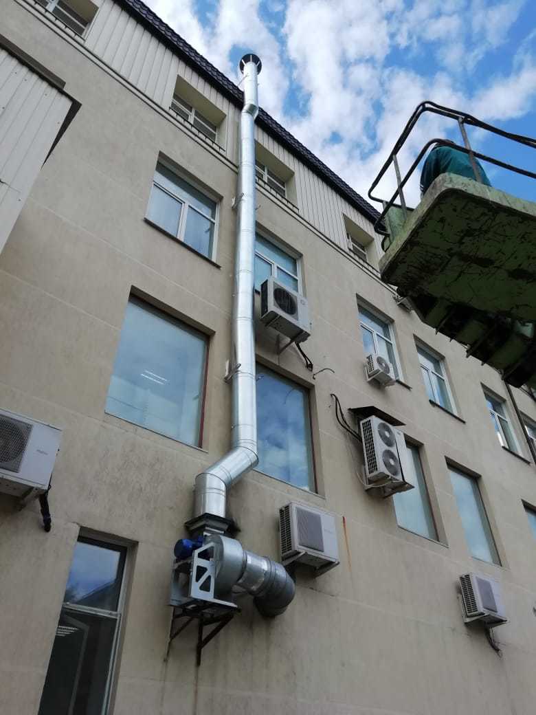 Проброшен вытяжной воздуховод вдоль фасада здания высотой 25 метров. Воздуховод прямошовный. Все соединения изолированы специальным герметиком. Полностью изменена система крепления, при сильном ветре отсутствует биение о фасад. Все делалось при работающей вытяжке.